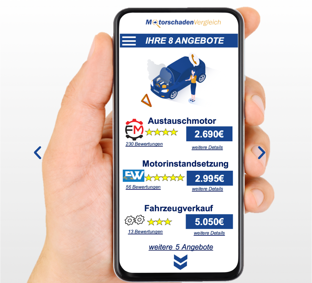 Für meinen defekten Motor am Ford habe ich keinen einzigen Angebot zur Reparatur erhalten. Die Angebote waren entweder zum Autoverkauf oder Lieferung von überteuerten Gebrauchtmotoren. Der neue Motor (nicht über Motorschaden Vergleich angeboten) kostet viel günstiger als die angebotene Gebrauchtmotoren. Ich gebe zwei Sterne wegen Weihnachtszeit, da eventuell auch das die Ursache gewesen war. Allerdings die Anfrage wurde zwei Wochen vor Weihnachten platziert und die Werkstatt um die Ecke schaffte es das Angebot zu erstellen und den Motor zu bestellen. Somit die Hoffnungen auf Motorschaden Vergleich waren umsonst und frustriert.