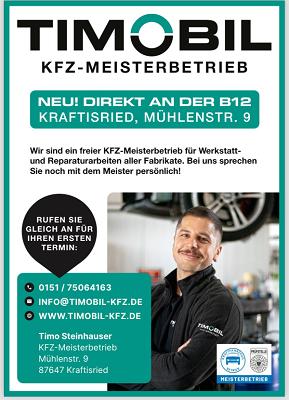 **Timobil KFZ-Werkstatt – Ihr zuverlässiger Partner für Autoreparaturen in Ostallgäu** Die **Timobil KFZ-Werkstatt** in der Mühlenstraße 9, 87647 Ostallgäu, steht für **höchste Qualität und Kundenzufriedenheit** – bestätigt durch eine **5,0-Bewertung**. Als vertrauenswürdige Werkstatt bietet Timobil ein **umfassendes Leistungsspektrum** rund um Ihr Fahrzeug, darunter **Inspektionen, Reparaturen, Bremsenservice, Klimaservice, Ölwechsel, Reifenwechsel und Unfallinstandsetzung**. Dank **jahrelanger Erfahrung und modernster Technik** garantiert das Team von Timobil **präzise Diagnosen, langlebige Reparaturen und faire Preise**. Jedes Fahrzeug wird mit **Sorgfalt und Fachwissen** behandelt – ob Kleinwagen, Familienauto oder Nutzfahrzeug. Warum Kunden die **Timobil KFZ-Werkstatt wählen**? ✅ **Top-Bewertung (5,0)** – zufriedene Kunden bestätigen exzellenten Service ✅ **Transparente Abrechnung & kompetente Beratung** ✅ **Schnelle Terminvergabe & zuverlässige Abwicklung** ✅ **Individuelle Lösungen für jeden Fahrzeugtyp** Vertrauen Sie auf **professionelle Autopflege in Ostallgäu** – besuchen Sie die **Timobil KFZ-Werkstatt** in der Mühlenstraße 9 oder vereinbaren Sie jetzt einen Termin! 🚗💨 *Ihre Werkstatt für Reparaturen, Wartung und Service mit Herz und Handwerk*