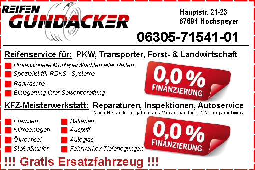 Der Reifen Gundacker in Hochspeyer. Eine Institution seit vielen, vielen Jahren im Bereich der Reifenbranche und rund ums Auto. Hier könnt ihr eure Reifen kaufen und montieren lassen. Ein Top Team im Büro und ein top Team in der Werkstatt beim Ausführen der Arbeiten. Hier sind sie wirklich gut beraten und bekommen Leistungen auf höchstem Niveau ausgeführt. Diese Firma kümmert sich außerordentlich gut darum ihre Kunden zu ihrer besten Zufriedenheit zu bedienen und das gelingt ihnen. Die passenden neuen Reifen für das gefahrene Fahrzeug zu finden und zu bekommen. Und dann zur vollsten Kundenzufriedenheit zu montieren. Macht weiter so und macht Kunden glücklich mit den Arbeiten die am Auto anstehen, wie eben das neue Reifen notwendig sind. Sehr zu empfehlen der Betrieb!!!